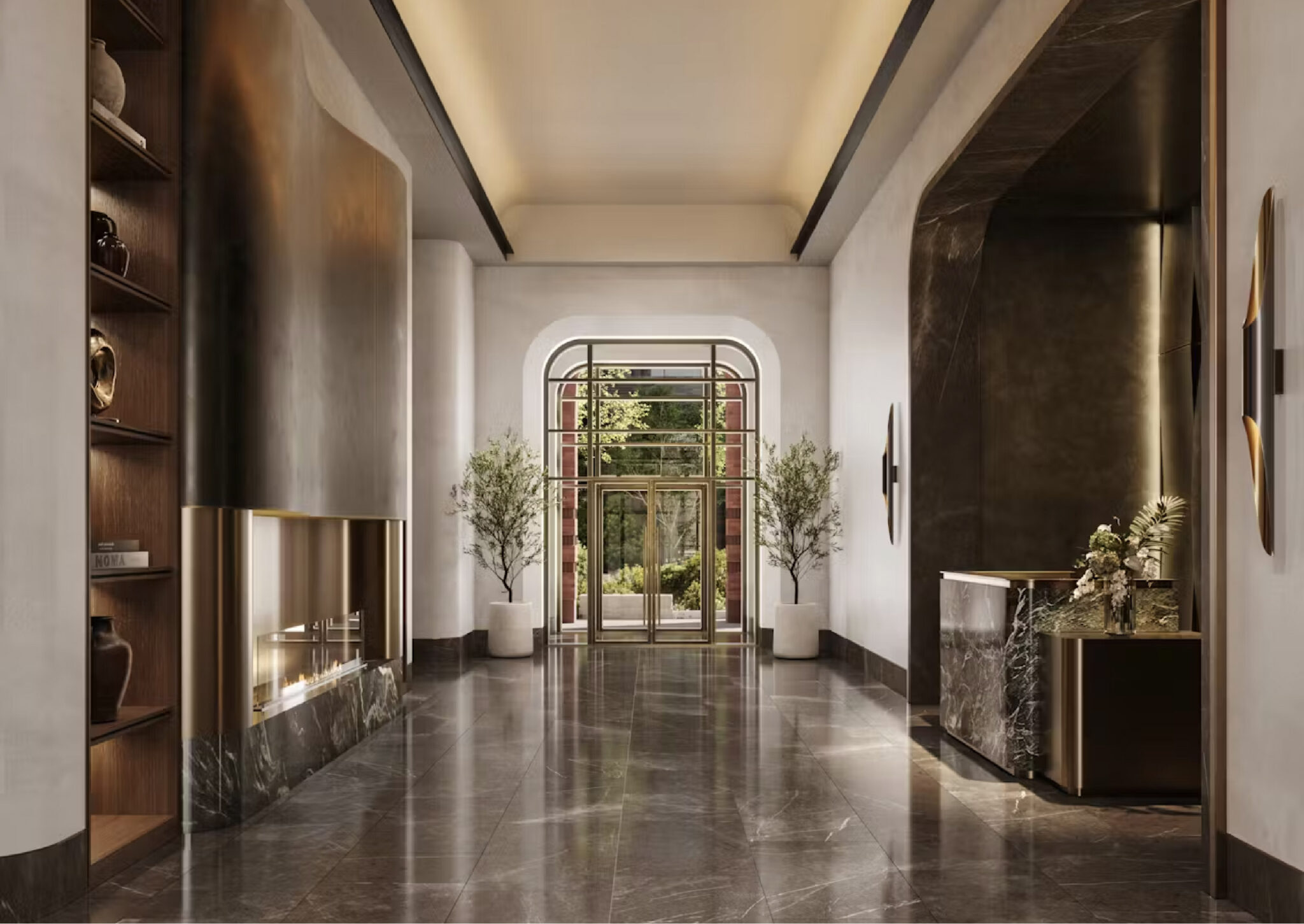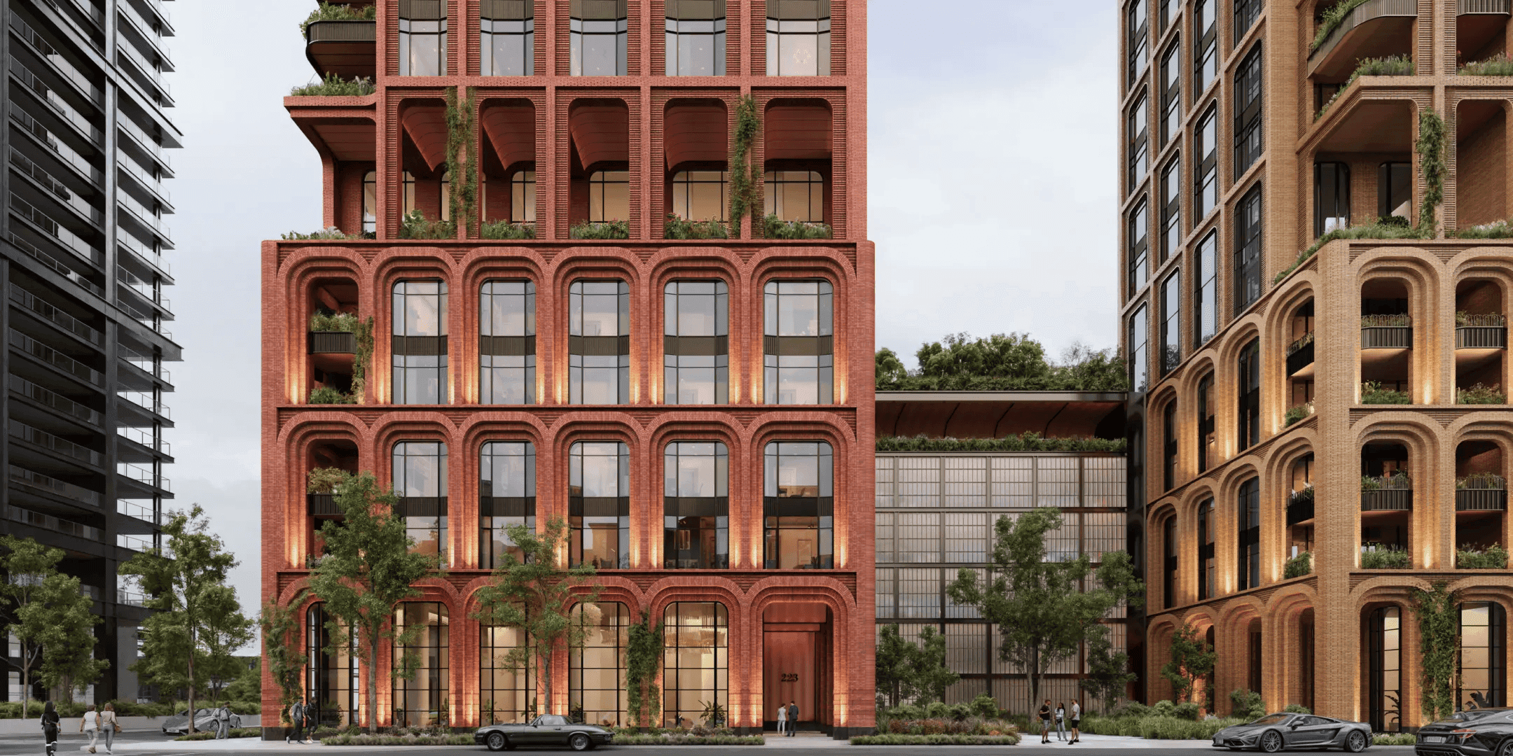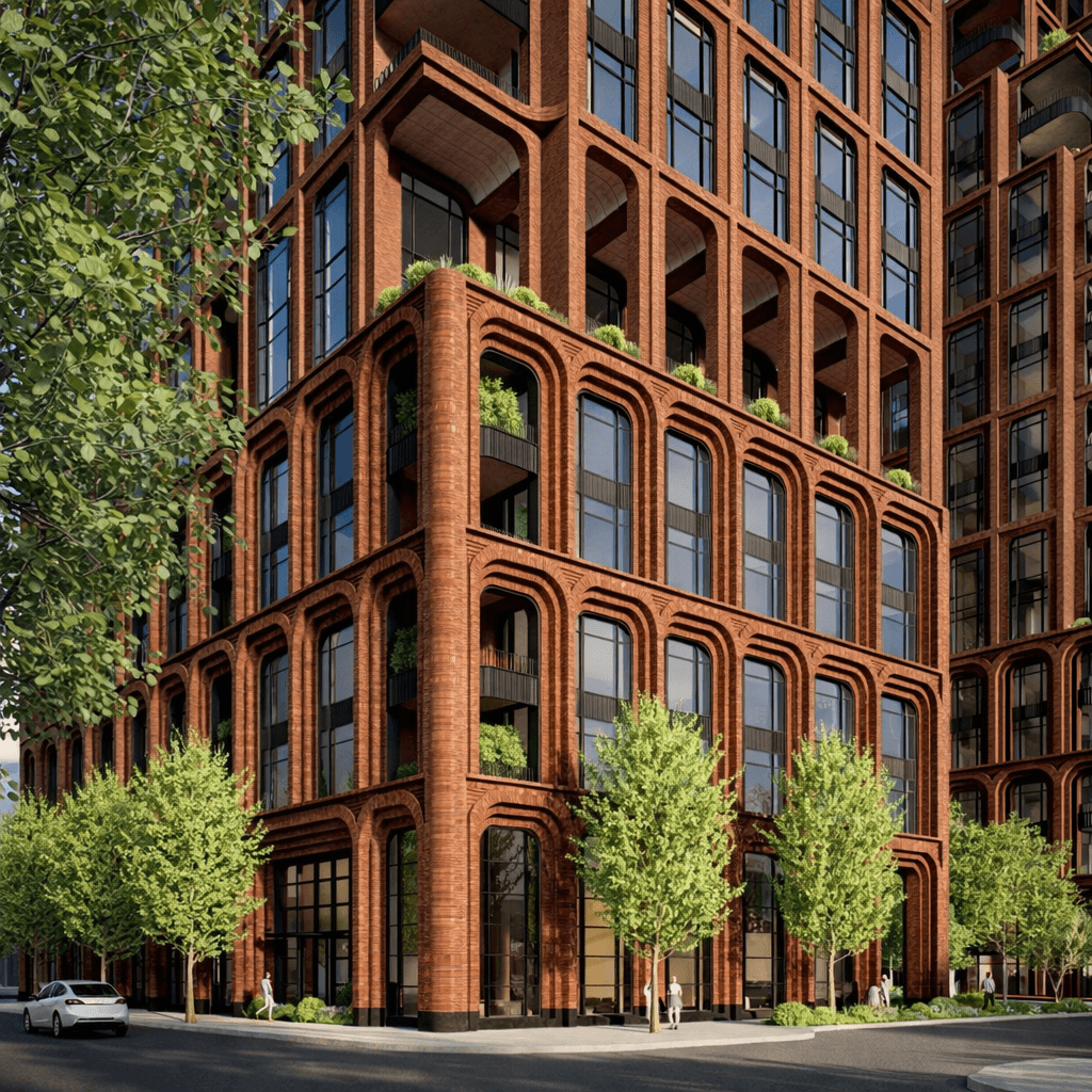 The architectural language draws inspiration from the historic industrial fabric that defines Fulton Market. A warm masonry façade and deep arched openings reinterpret traditional warehouse architecture while creating a contemporary identity for the building. The articulated façade introduces rhythm, depth, and shadow, giving the towers a strong presence within the skyline while maintaining a human-scaled experience at street level.