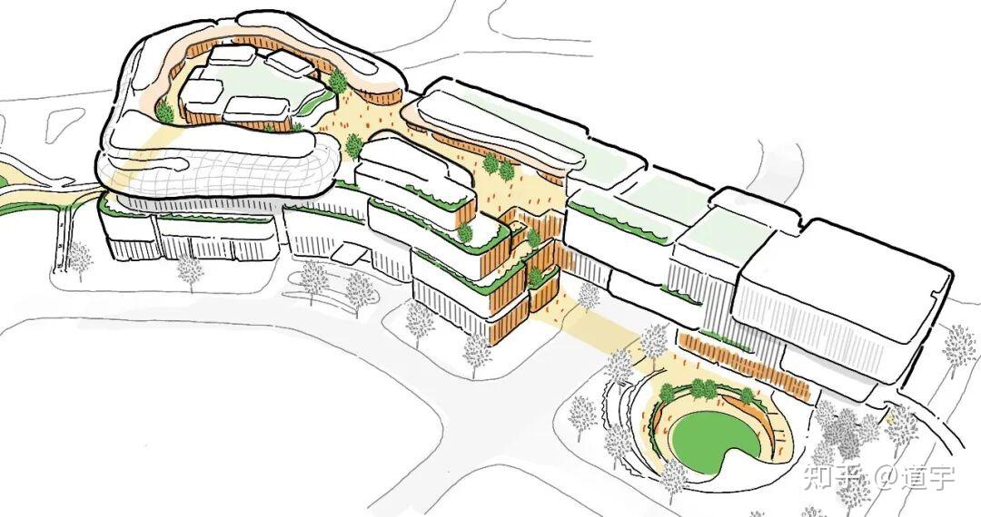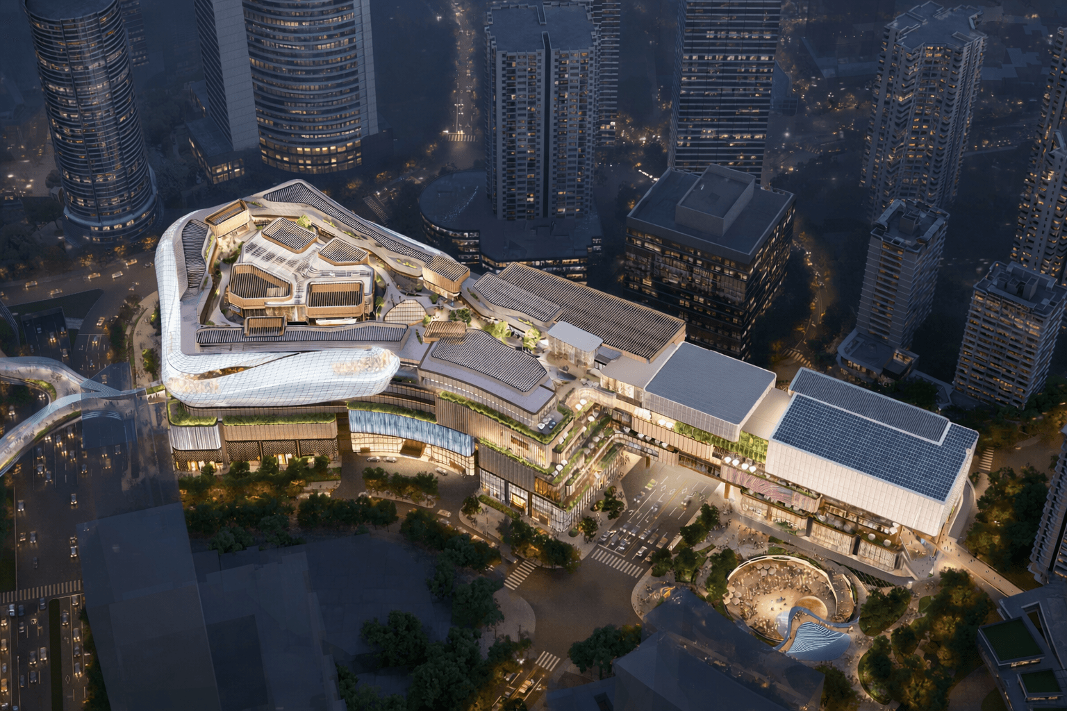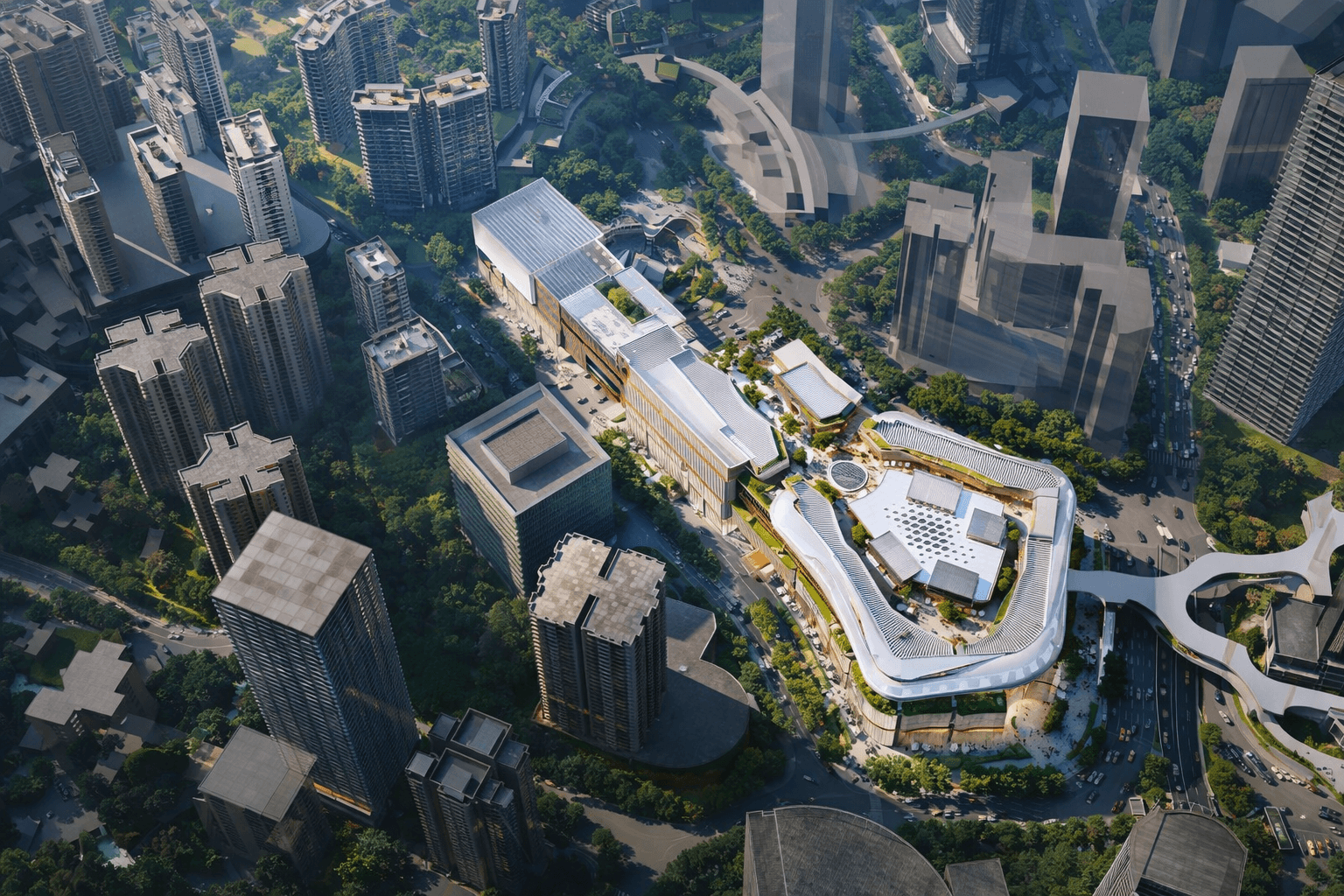 The architectural language of Central MixC emphasizes fluid forms and horizontal layering to create a dynamic relationship between built space and landscape. Terraces, rooftop gardens, and open promenades provide moments of pause while maintaining visual continuity across the site. This layered composition reduces the perceived scale of the complex while offering a variety of spatial experiences for visitors moving through the development.